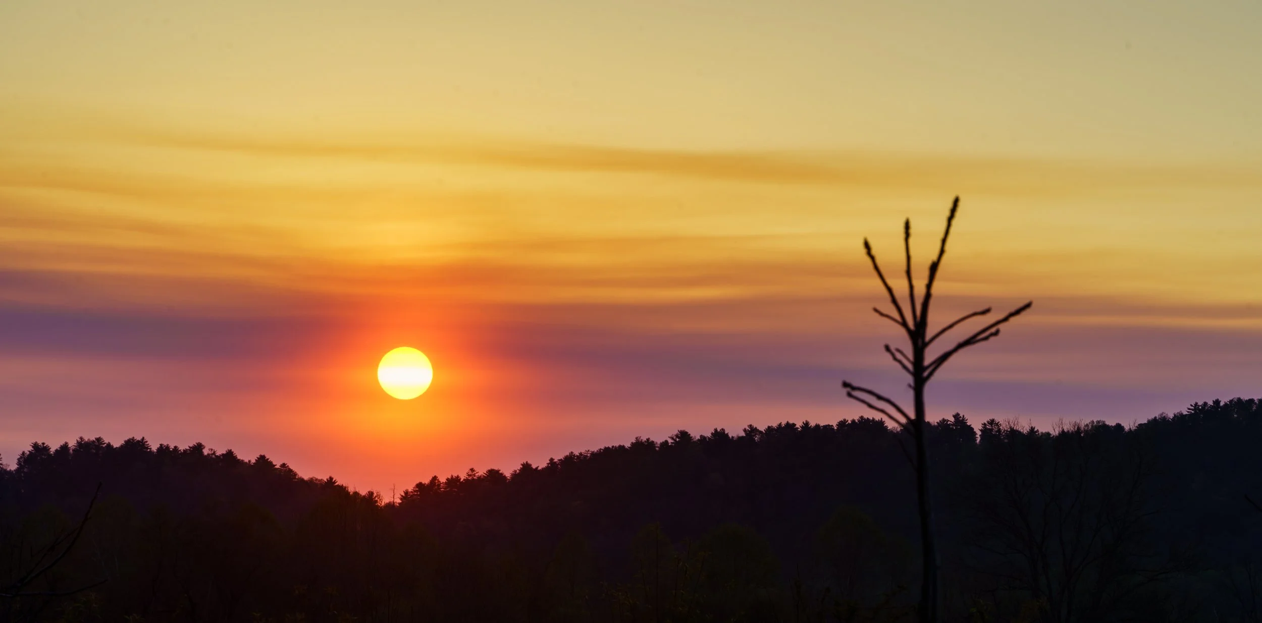 This sunset photograph captures the fleeting moment as the sun descends beyond the horizon, painting the sky with a palette of warm hues. The vibrant oranges, yellows, reds, and deep purples meld together, creating a serene backdrop that highlights the day's end. Silhouettes of the distant mountains, with the lone tree, add depth to the composition, framing the stunning colors and inviting the viewer to reflect on the day’s experiences. The spring day had been bright and cheerful, and I was hoping for a golden sunset to end the day. I wasn’t disappointed, as I watched the daylight turn into night. It was almost as if the sun was headed for the notch in the mountains. I felt so lucky to be able to view, and to capture this moment. This sunset was unique, one of nature’s masterpieces that evokes a sense of tranquility and wonder.